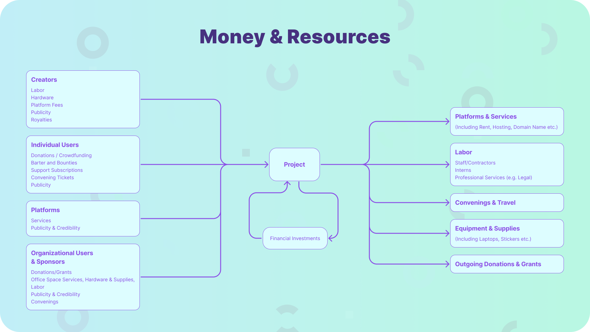 It's also helpful to think about "protector" activities or expenses that reduce potential risks for the project. For example, paying for a lawyer to file a trademark application for you might protect contributors from future headaches when users get confused by imitators. And organizing a code of conduct and paying for an implementation training workshop could prevent headaches, time-consuming incidents, and contributor attrition -- especially if you're planning to host in-person events.